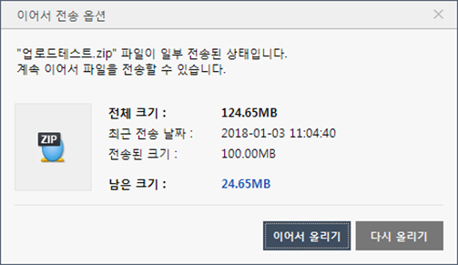 네트워크를 단절했다면 네트워크를 연결하고 다시 전송합니다. 다음과 같이 전송이 중지된 파일을 이어서 올리거나 처음부터 다시 올릴 수 있습니다.